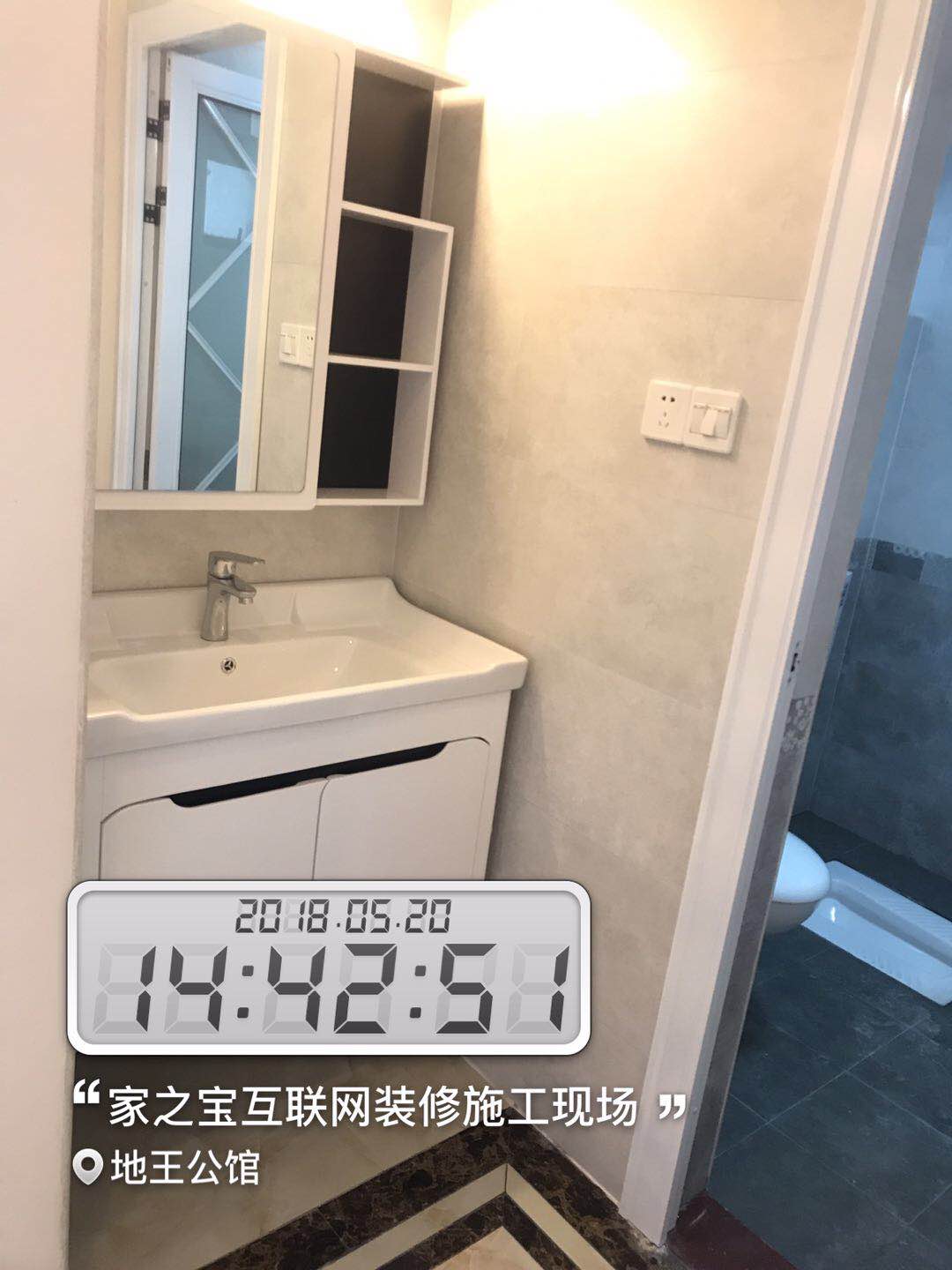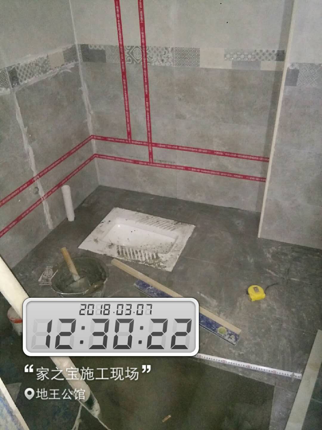 墻磚鋪貼,使用水平儀投射水平線,陽(yáng)角處采用磨邊45°碰角工藝。