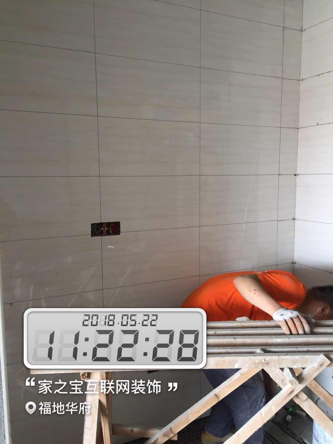 墻磚鋪貼,使用水平儀投射水平線,陽角處采用磨邊45°碰角工藝。