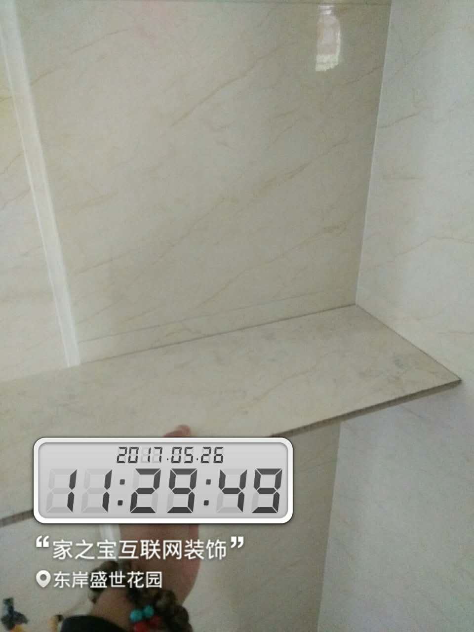 墻磚鋪貼,使用水平儀投射水平線,陽角處采用磨邊45°碰角工藝。