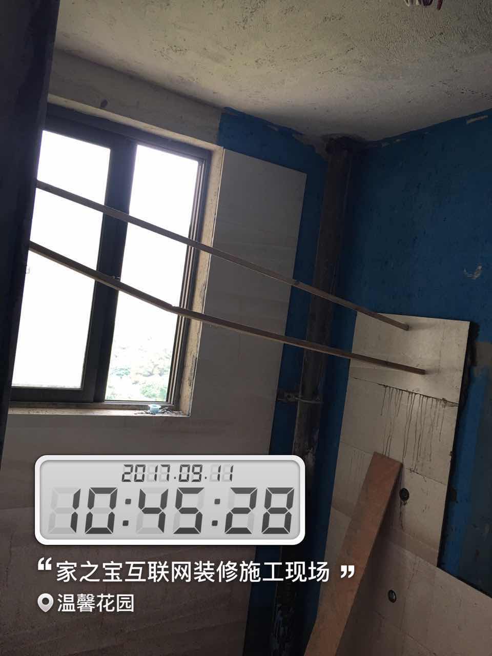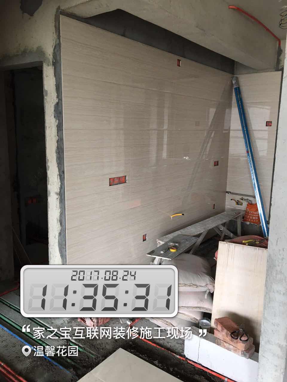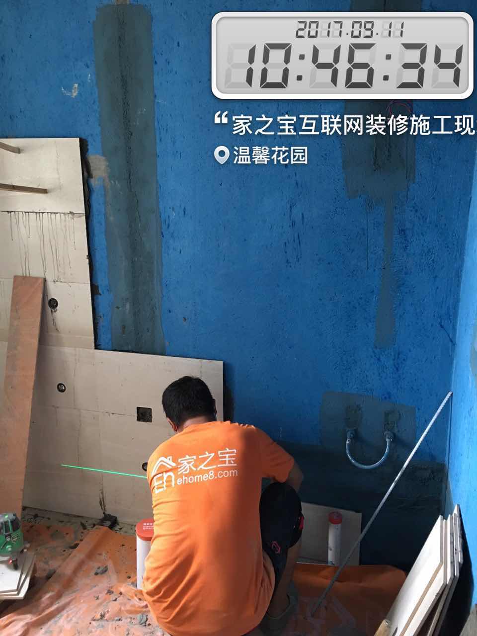 墻磚鋪貼,使用水平儀投射水平線,陽角處采用磨邊45°碰角工藝。