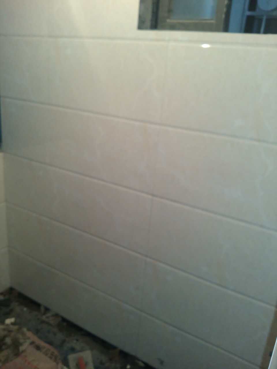墻磚鋪貼,使用水平儀投射水平線,陽(yáng)角處采用磨邊45°碰角工藝。
